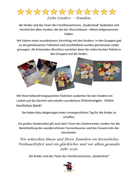 Danke für Ihre Bereitschaft, diese Aktion zu unterstützen, für jeden erfüllten Wunsch und für so viel Mitgefühl. Gemeinsam haben Sie vielen Kindern eine große Freude gemacht
